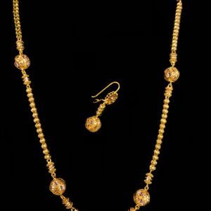 A bridal masterpiece, the Victorian Ruby Pearl Elegance Gold Set captures the charm of a bygone period while remaining a classic. Pearls, Zircons, and Ruby stones of varying colours, all set in gleaming gold, make up this magnificent outfit.